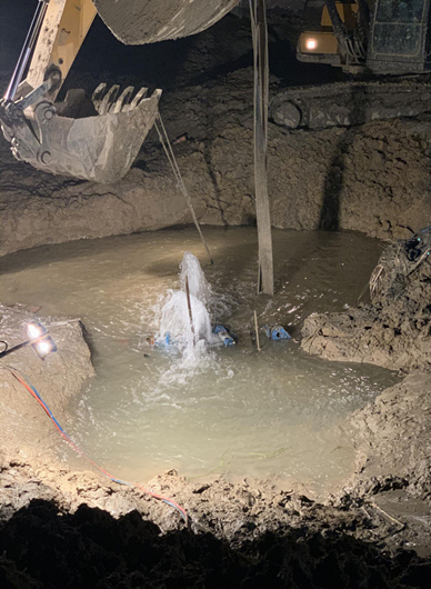 時(shí)間已經(jīng)過去了24小時(shí),如果水再供應(yīng)不上,將會(huì)對(duì)郭村鎮(zhèn)正常生產(chǎn)生活秩序造成巨大影響。水務(wù)公司總經(jīng)理王智勇、龍泉公司經(jīng)理韓春暉、惠民公司經(jīng)理王永慶等領(lǐng)導(dǎo)立即啟動(dòng)重大搶修工作一級(jí)響應(yīng),迅速趕赴現(xiàn)場(chǎng),召開緊急會(huì)議,親自指導(dǎo),開展工作。一方面與鎮(zhèn)政府協(xié)調(diào)延長(zhǎng)供水時(shí)間,調(diào)用應(yīng)急供水車,采用流動(dòng)供水的方式緩解全鎮(zhèn)的供水壓力;另一方面研究搶修處置方案,經(jīng)過群策群力,最終確定了帶水作業(yè)的方案。一夜未眠的朱師傅再次穿上水下防護(hù)服,帶著其他搶修突擊隊(duì)員們進(jìn)入工作坑,開始了艱難而緊張的搶修工作。