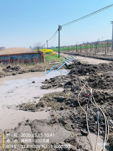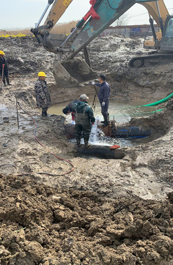搶修就是命令,時(shí)間就是效率。根據(jù)公司主要領(lǐng)導(dǎo)安排,于2020年3月15日上午8點(diǎn)40分,朱忠東師傅、嚴(yán)慶章師傅等先后帶領(lǐng)我們維修人員、機(jī)具、物料進(jìn)入現(xiàn)場(chǎng)作前期準(zhǔn)備,一邊開挖工作坑,一邊抽水機(jī)抽水,采取歇人不歇機(jī)的辦法保證迅速挖出漏水口。由于農(nóng)田土質(zhì)松軟,再加上長(zhǎng)時(shí)間被水浸泡,導(dǎo)致挖機(jī)多次陷入土中,嚴(yán)重影響了開挖進(jìn)度。經(jīng)驗(yàn)豐富的嚴(yán)師傅立即向指揮部反映,調(diào)來了一個(gè)大鋼板作為鋪墊,再將挖機(jī)置于鋼板上進(jìn)行操作,順利解決了挖機(jī)塌陷的問題。經(jīng)過了兩個(gè)小時(shí)的開挖,漏水口終于顯現(xiàn)出來。朱師傅立即換上了“戰(zhàn)服”,“潛入”工作坑為搶修作準(zhǔn)備。