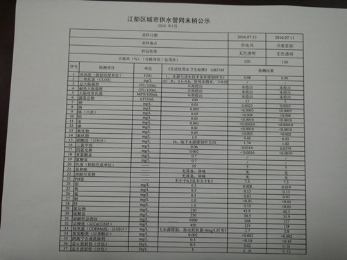 2016年7月江都區(qū)城市供水管網(wǎng)末梢公示