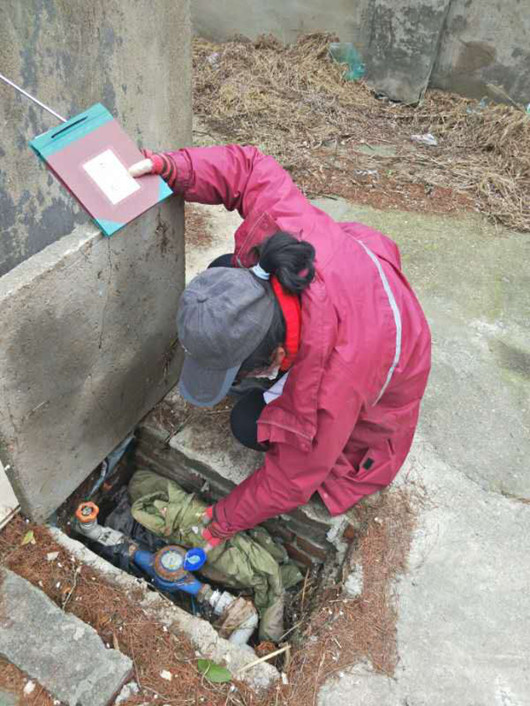 2月21日上午,多云。朱師傅頭戴鴨舌帽,佩戴口罩,膠手套,穿著雨衣,做好個人防護(hù)措施,帶著抄收賬簿、分揀好的發(fā)票、手電筒、撬棒來到二姜區(qū)域,開始“抄收復(fù)工”。“你是誰,廠子還沒復(fù)工,領(lǐng)導(dǎo)沒來呢!”二姜四方電鍍廠門衛(wèi)一開始沒認(rèn)出全副武裝,只露出兩只眼的朱師傅,很警惕。“姜師傅,您好!我是抄表員小朱,來看看急降溫后廠子供水是否正常運(yùn)行,順便抄表。”朱師傅配合好鞋底消毒和體溫槍測量體溫后,先在廠子里巡查一圈,未發(fā)現(xiàn)漏水現(xiàn)象,然后來到廠西南角水表處,她嫻熟地打開水表井,“表深要確保表讀數(shù)精確,避免用戶不滿意”,她一邊嘀咕著一邊左手拿出手電筒照明,右手用紙手帕擦拭去水表玻璃上的污垢,認(rèn)真讀表,確認(rèn)讀數(shù)“7078m³”。