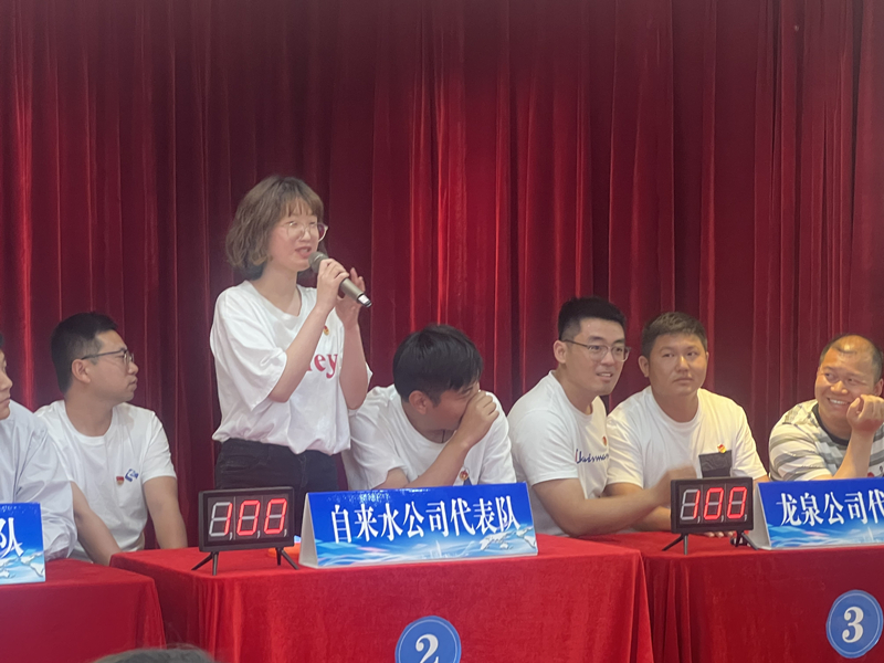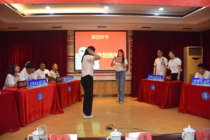 此次比賽分為小組共答題、個人必答題、搶答題、你劃我猜、風(fēng)險(xiǎn)題五種形式,并分五輪進(jìn)行。共有五支代表隊(duì)參賽,分別是惠民、自來水、龍泉、水務(wù)、污水公司代表隊(duì),且每個代表隊(duì)人員都是經(jīng)過層層篩選脫穎而出的。大家顯然是有備而來的,競賽過程精彩激烈,參賽選手們有的運(yùn)籌帷幄、有的胸有成竹、有的應(yīng)對自如,各代表隊(duì)你追我趕、搶答器的聲音此起彼伏,現(xiàn)場戰(zhàn)況異常激烈,展示出了新時代水務(wù)公司團(tuán)員青年的風(fēng)采。