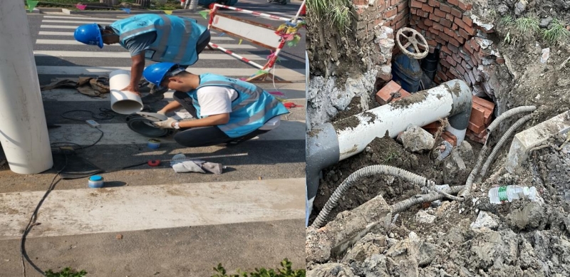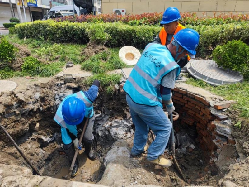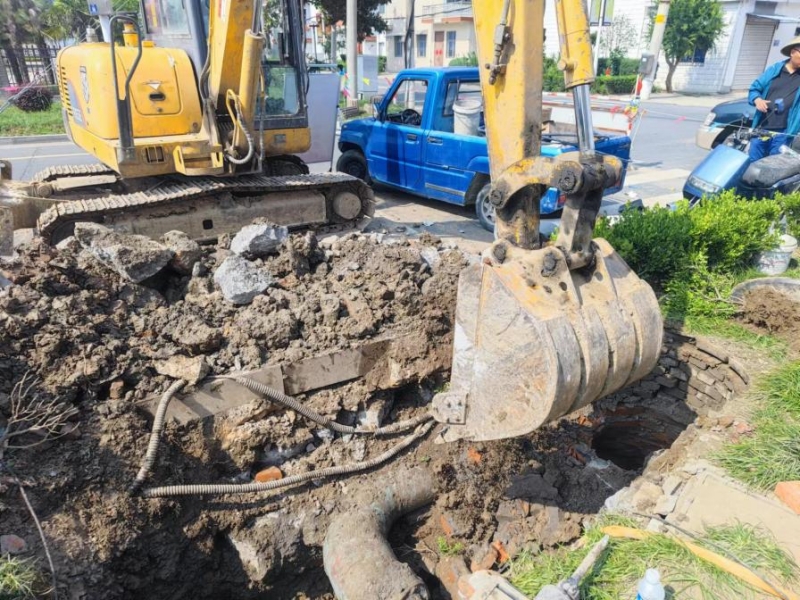 此次維修的是老水廠鋪設(shè)的DN200的PVC管道,但在施工過程中遇到了較多困難,當(dāng)挖掘機(jī)破開路面時,發(fā)現(xiàn)需要破除80公分左右厚度的混凝土,但中間是DN300的鋼管,漏點(diǎn)卻在鋼管下方的PVC管與球管連接處,這無疑給施工增加了很大的難度。挖掘機(jī)施工時,稍有不慎就會破壞中間鋼管,只能通過手動一邊用風(fēng)鎬、洋鎬等進(jìn)行破碎,一邊用鐵鍬進(jìn)行開挖,同時還需要抽水作業(yè)。由于當(dāng)天室外氣溫高達(dá)34攝氏度,烈陽高照,汗水早已浸濕了現(xiàn)場施工人員的衣服,但他們不怕苦、不怕累,克服各種困難,通過3個小時不間斷地?fù)屝,最終完成這段老舊管道的維修更換。