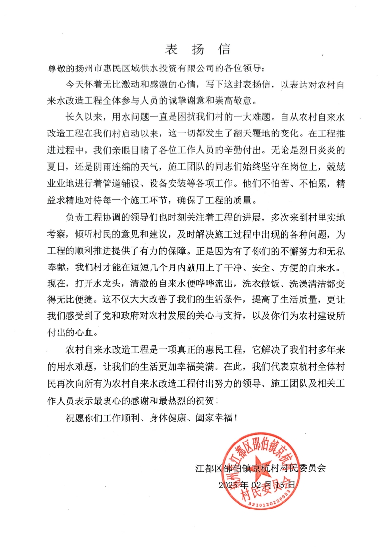 “長久以來,用水問題一直是困擾我們村的一大難題。自從農(nóng)村自來水改造工程在我們村啟動以來,這一切都發(fā)生了翻天覆地的變化”;“負(fù)責(zé)工程協(xié)調(diào)的領(lǐng)導(dǎo)們也時刻關(guān)注著工程的進(jìn)展,多次來到村里實地考察,傾聽村民的意見和建議,及時解決施工過程中出現(xiàn)的各種問題,為工程的順利推進(jìn)提供了有力的保障”;“在工程推進(jìn)過程中,我們親眼目睹了各位工作人員的辛勤付出。無論是烈日炎炎的夏日,還是陰雨連綿的天氣,施工團(tuán)隊的同志們始終堅守在崗位上,兢兢業(yè)業(yè)地進(jìn)行著管道鋪設(shè)、設(shè)備安裝等各項工作。”以上內(nèi)容是一封來自江都區(qū)邵伯鎮(zhèn)京杭村村民委員會送給邵伯供水管理所的《表揚(yáng)信》,信中不僅飽含用戶對于自來水條件改善的感謝之情,同時還是對公司工作的肯定,表揚(yáng)信中提及到公司為改善京杭村用水所做出的努力,其中既有北片維修所和邵伯供水所團(tuán)隊不辭辛勞現(xiàn)場來回的協(xié)調(diào)解決矛盾的身影,又有施工人員克服惡劣施工環(huán)境力爭保質(zhì)保量完成工程改造辛勤的的付出,正是這樣的一封表揚(yáng)信讓身為水務(wù)人感到自豪與驕傲,用戶的滿意才是對我們工作最大的肯定。